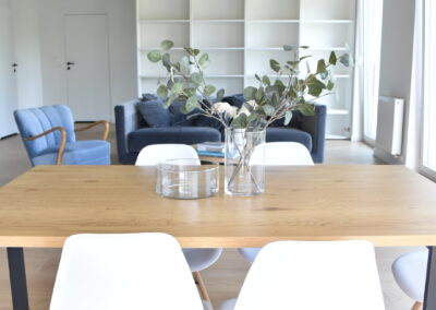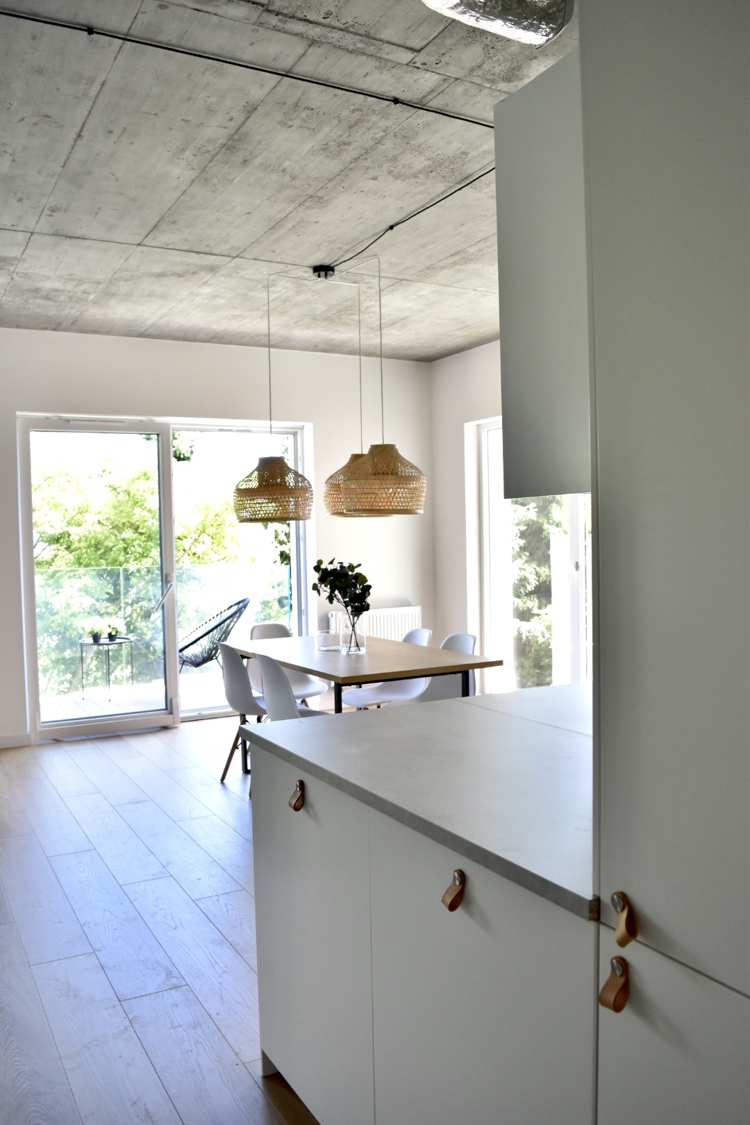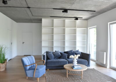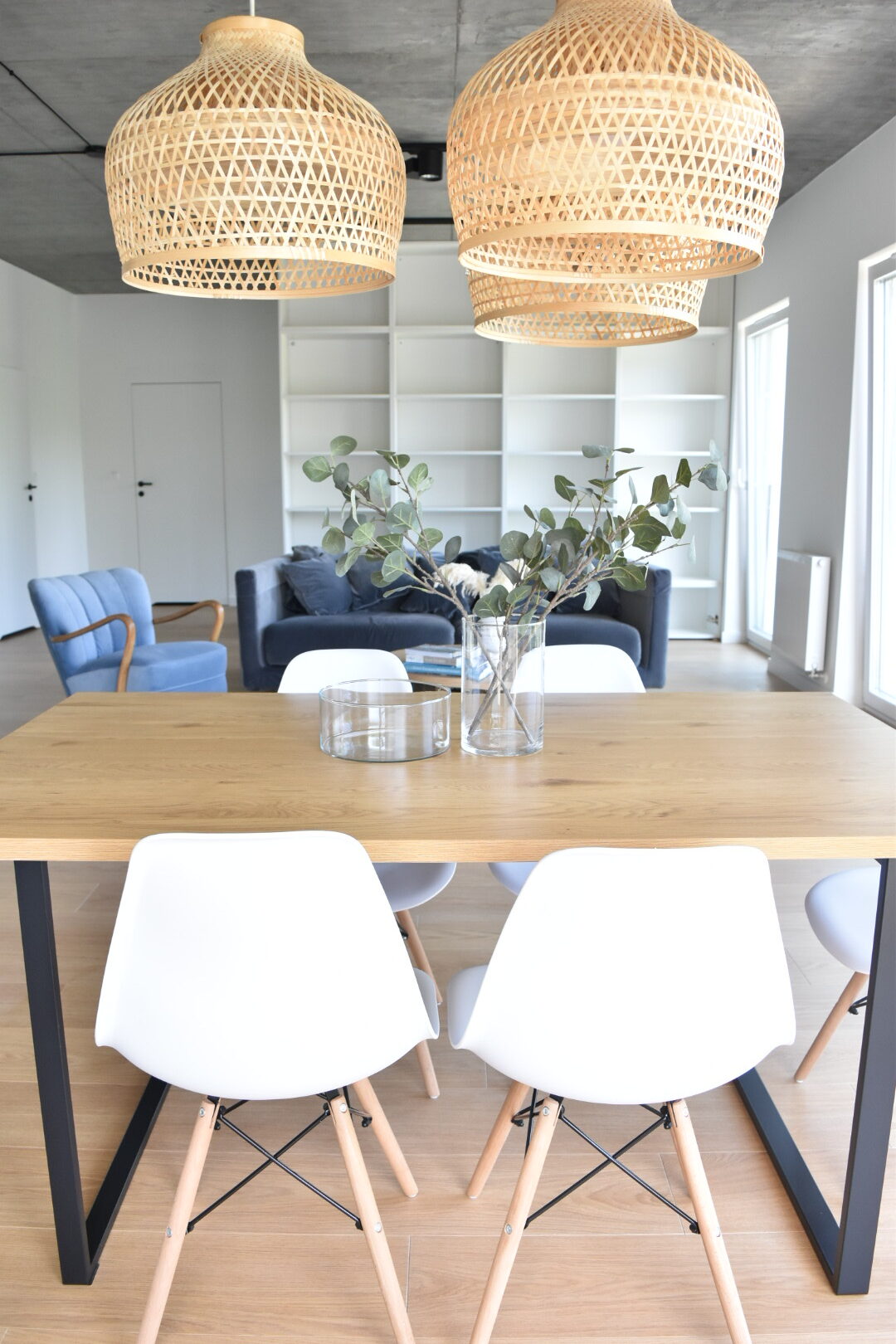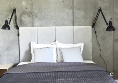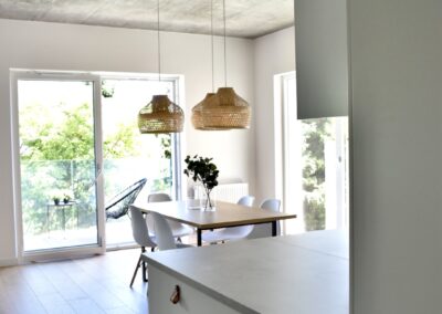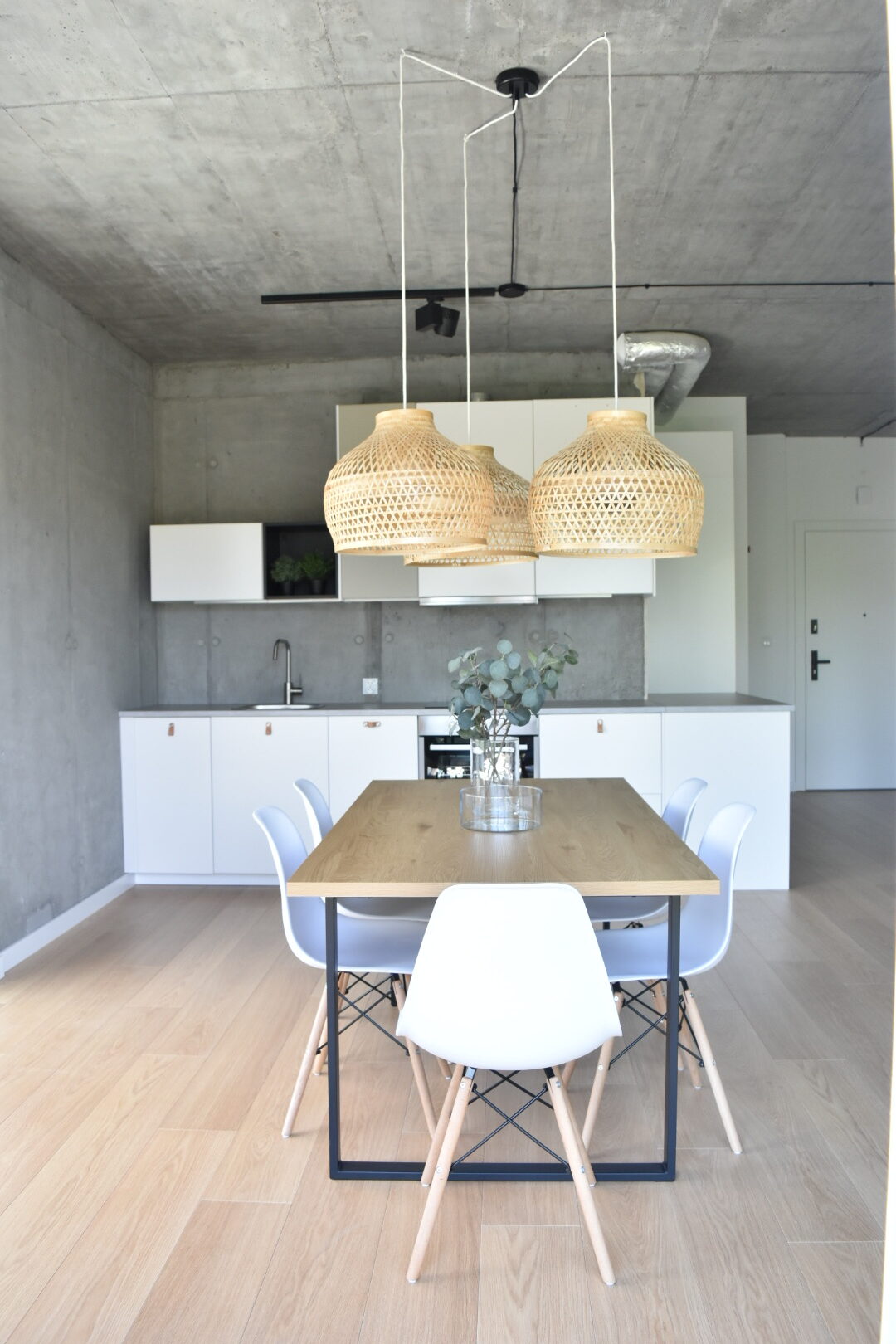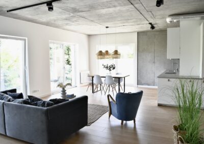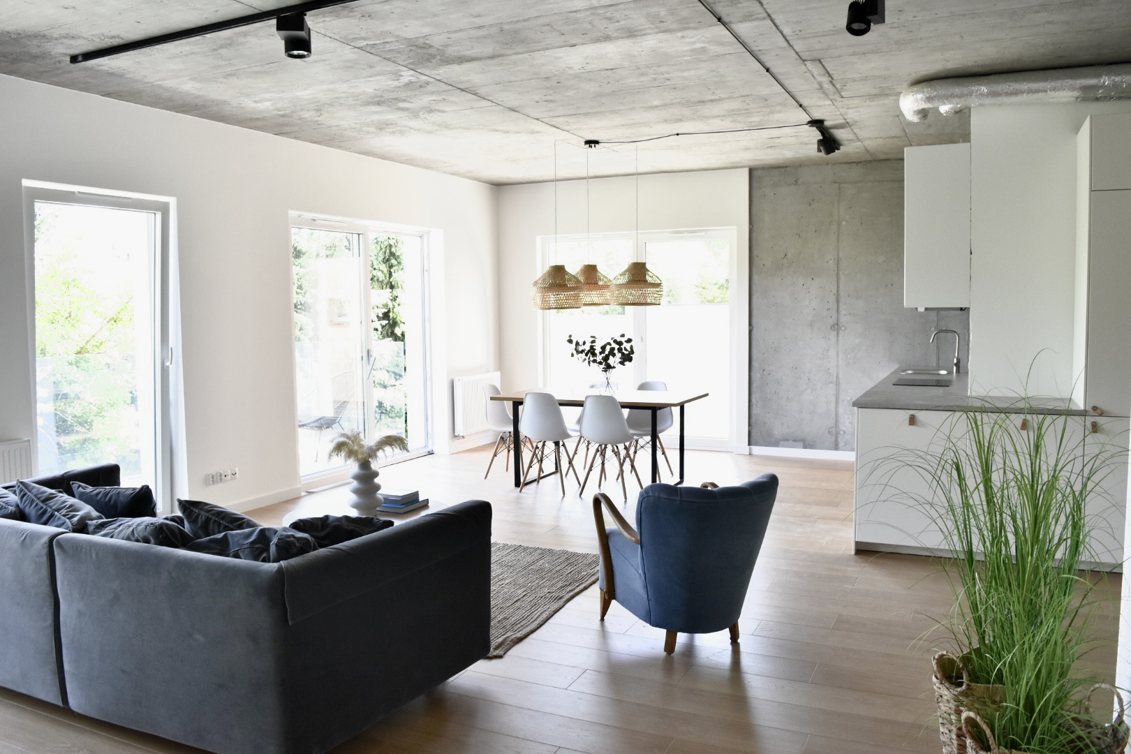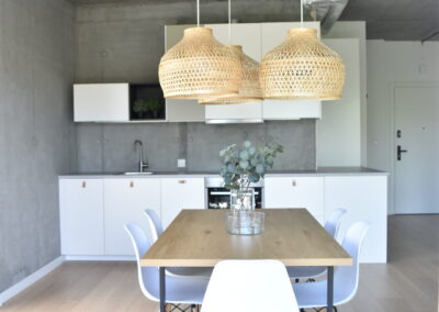 Apartament typu Loft. Przestronny salon z kuchnią i jadalnią. Otwarta sypialnia z garderobą. W salonie miejsce do pracy.