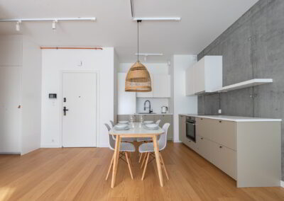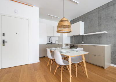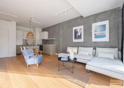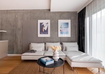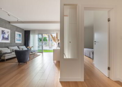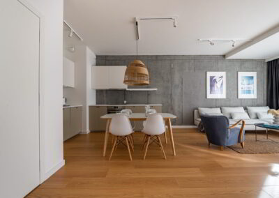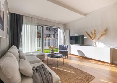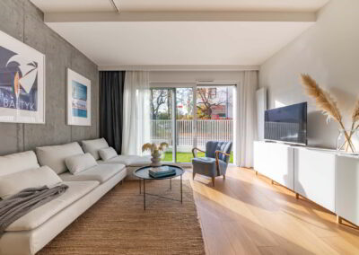 Apartament z przestronnym salonem, aneksem kuchennym i jadalnią. Położony na parterze z ogródkiem.
